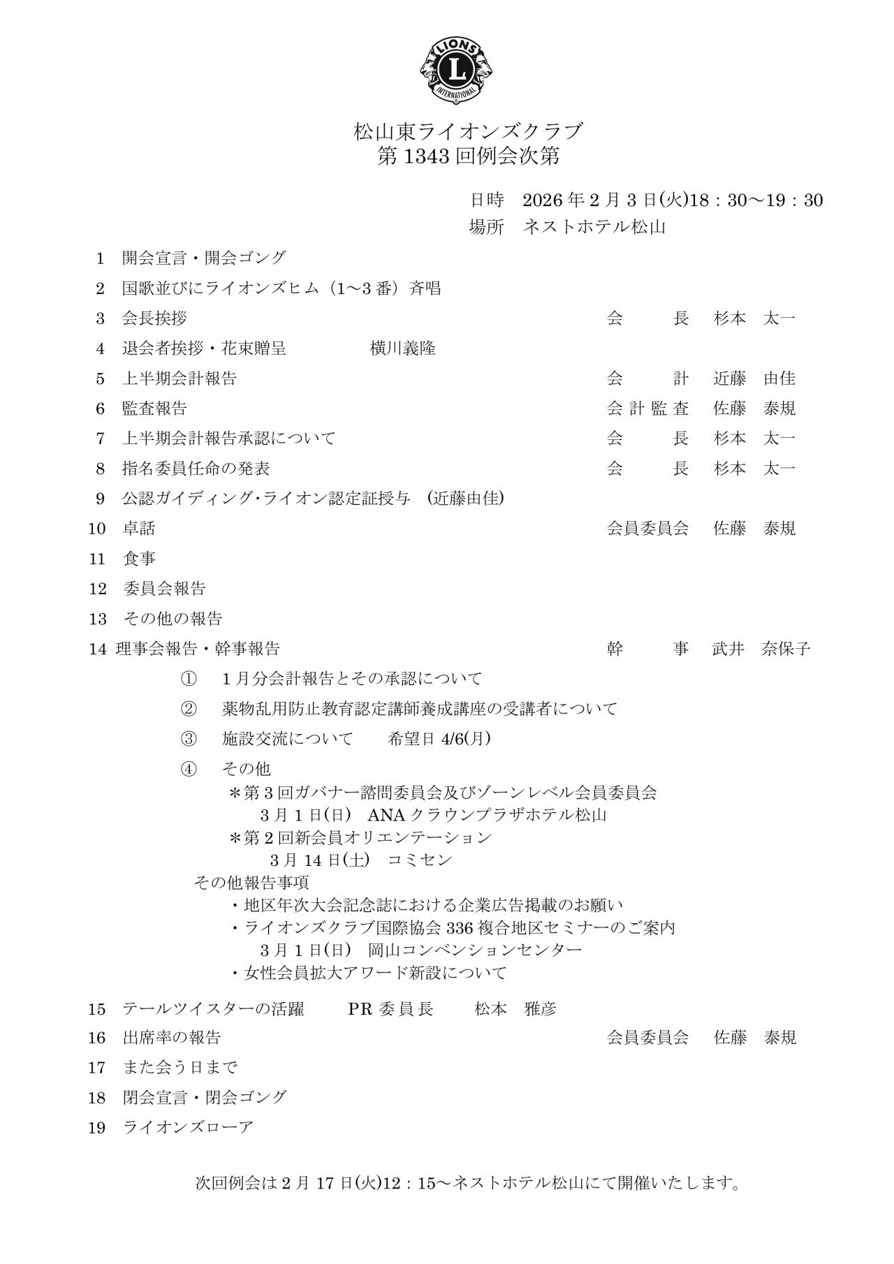 2026年2月3日(火)18時30分~19時30分 松山東ライオンズクラブ第1343回例会が実施されました。
