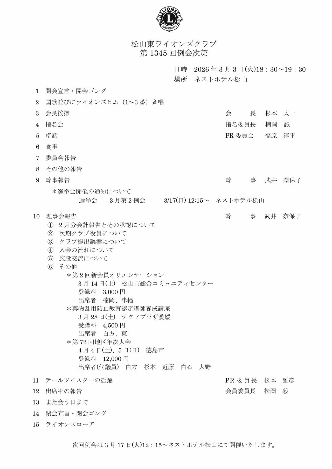 2026年3月3日(火)18時30分~19時30分 松山東ライオンズクラブ第1345回例会が実施されました。